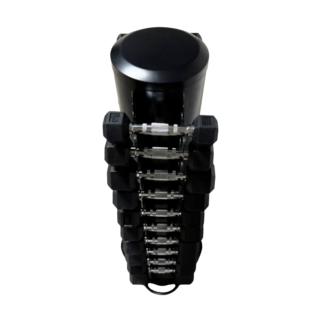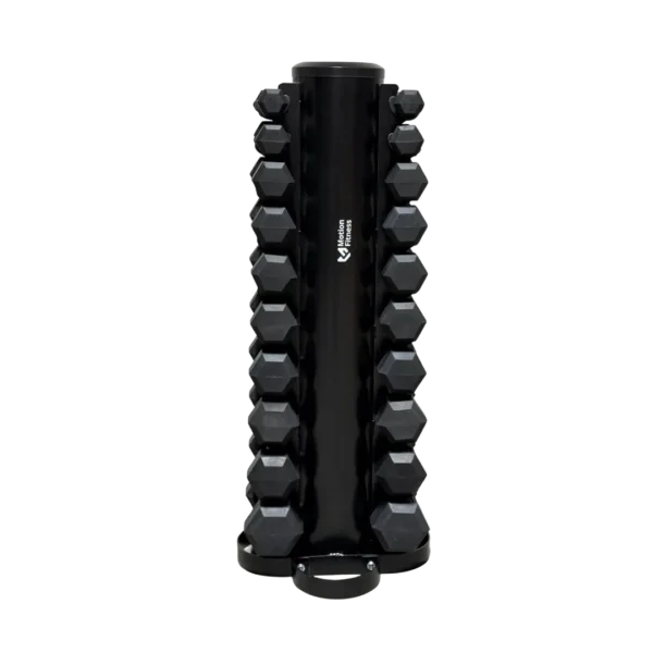 Det medfølgende Motion Fitness-hantelstativet er spesialdesignet for å romme alle de 10 parene med sekskantede manualer (20 totalt). Stativet er stabilt og tar minimalt med plass, noe som gjør det til en ideell løsning for både hjemmetreningsstudioer og kommersielle treningsfasiliteter som ønsker å holde orden og maksimere plassen.
