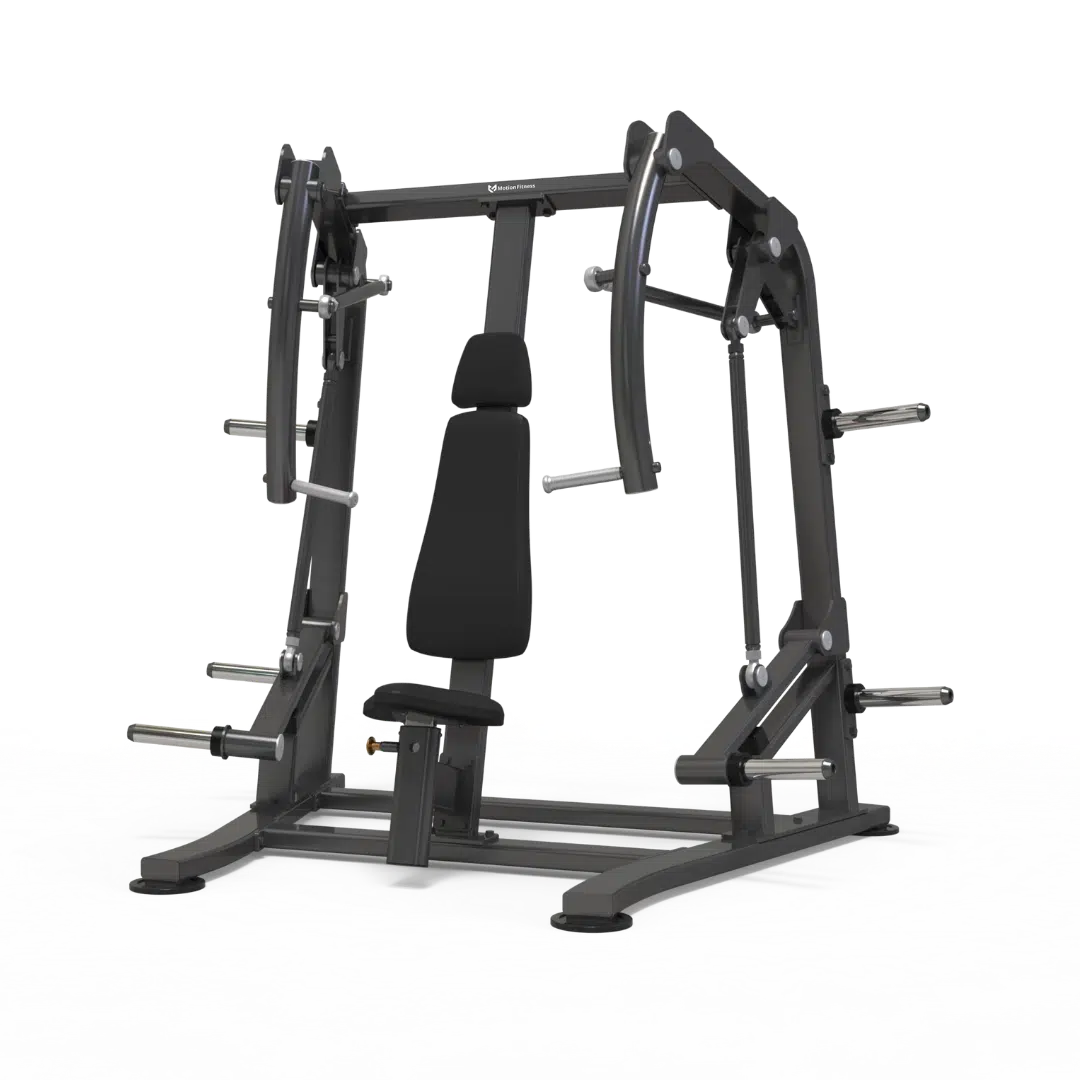 Chest Press ger en jämn, trygg pressrörelse som passar företagsgym, bostadsrättsföreningar, hotell, rehabcenter och kommersiella gym. Maskinens konvergerande armar följer bröstets naturliga rörelsebana och låter även triceps arbeta stabilt. Tack vare multigrepp i räfflad aluminium hittar både korta och långa användare en bekväm handställning, medan säte och ryggdyna justeras med ett enkelt grepp. Klädseln är svettresistent och antibakteriell, och den halkfria basen står stadigt på alla golv. Undersöka hela sortimentet av bröstmaskiner.
