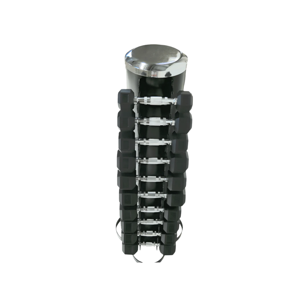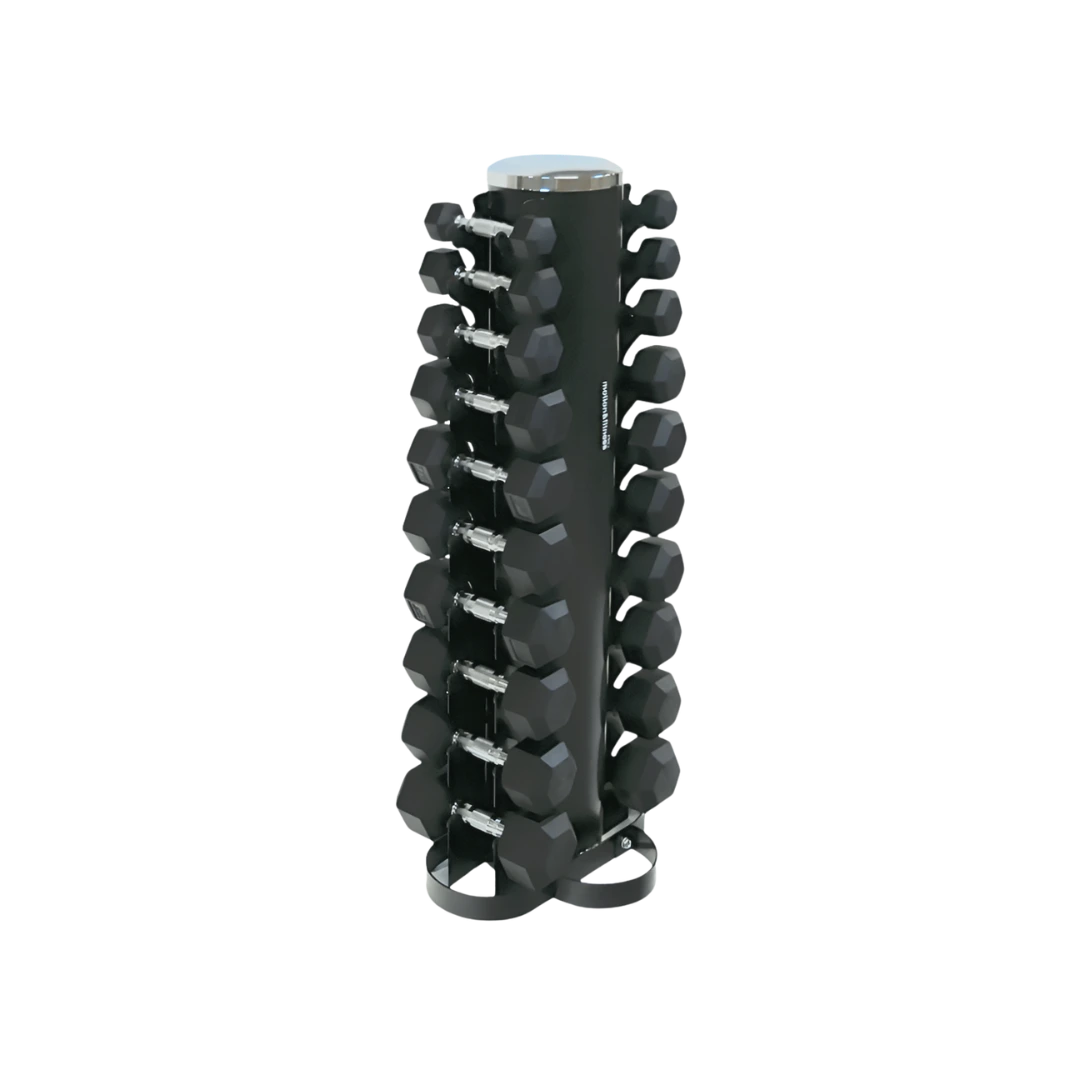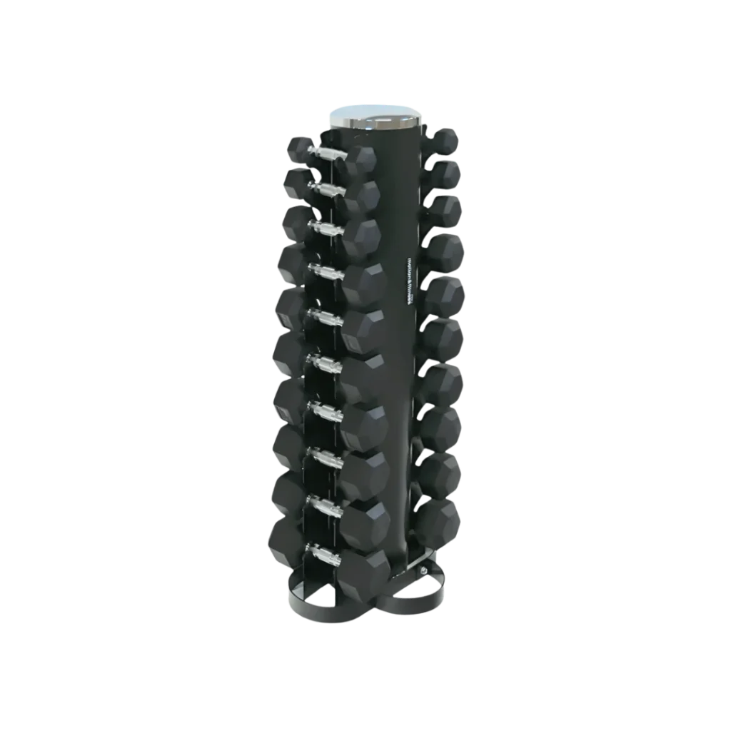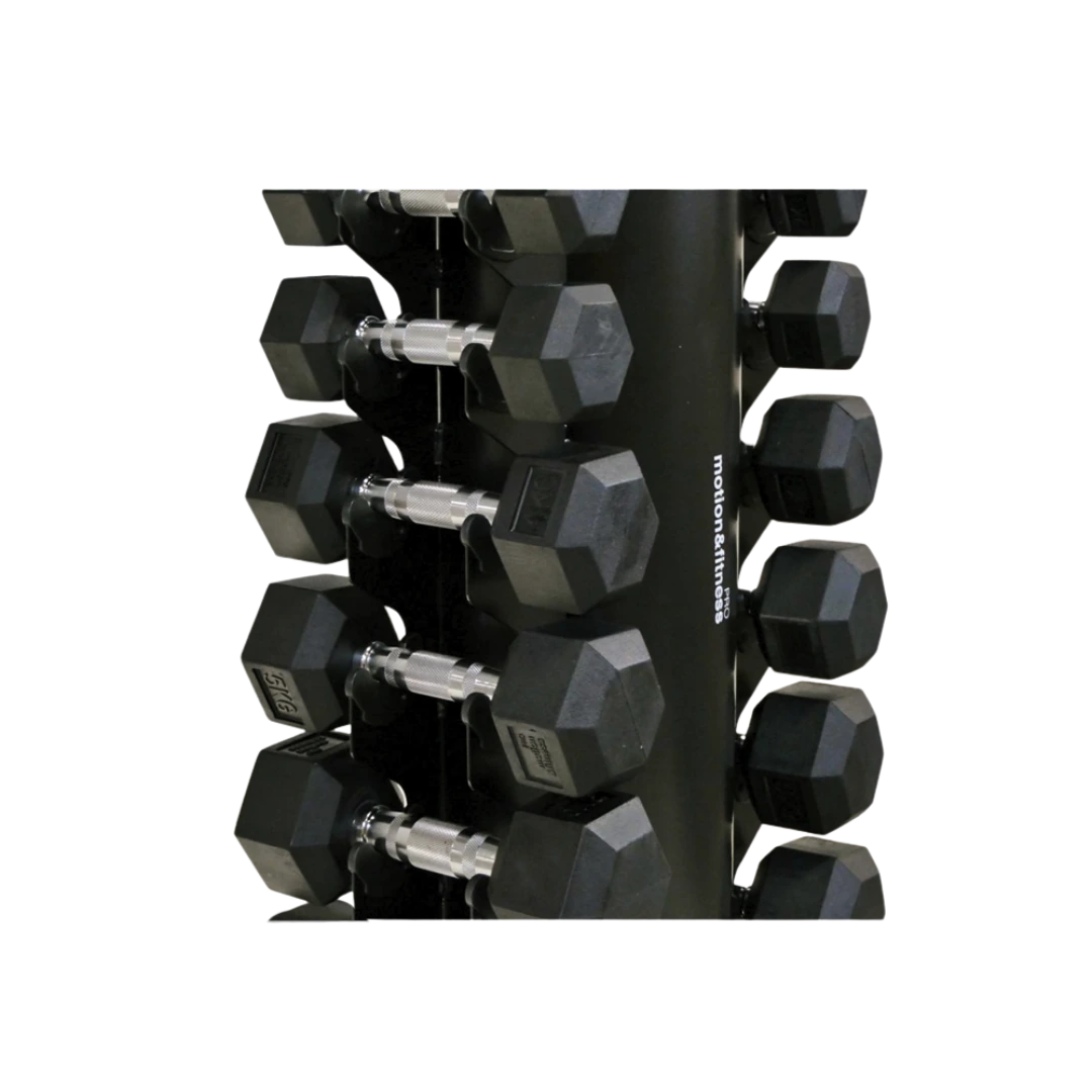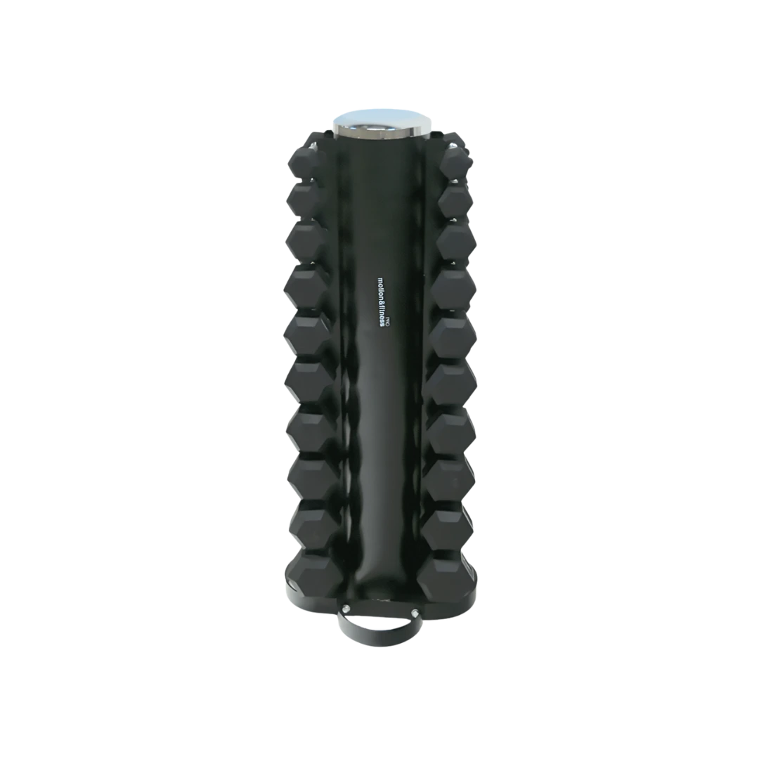 Det medföljande Motion Fitness hantelstället är speciellt utformat för att rymma alla 10 paren av hexagonhantlar (20 stycken totalt). Stället är stabilt och tar minimalt med plats, vilket gör det till en idealisk lösning för både hemmagym och kommersiella träningsanläggningar som vill hålla ordning och maximera utrymmet.